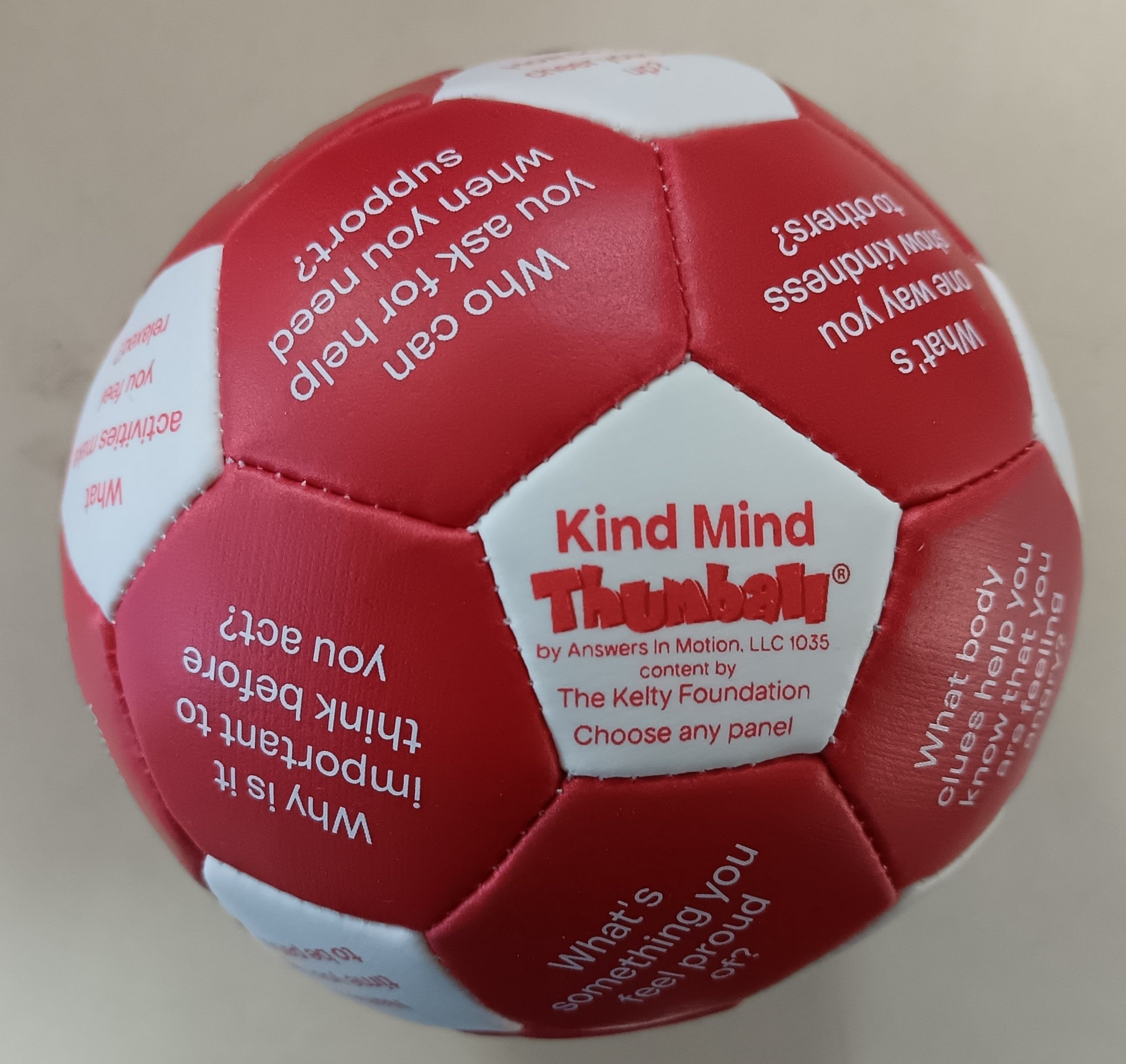 Designed to spark reflection and dialogue, the Kind Mind Thumball prompts participants to explore key social-emotional learning attributes—such as belonging, generosity, emotion awareness, coping skills, independence, and responsible decision-making—and consider how these skills contribute to a healthy mind.